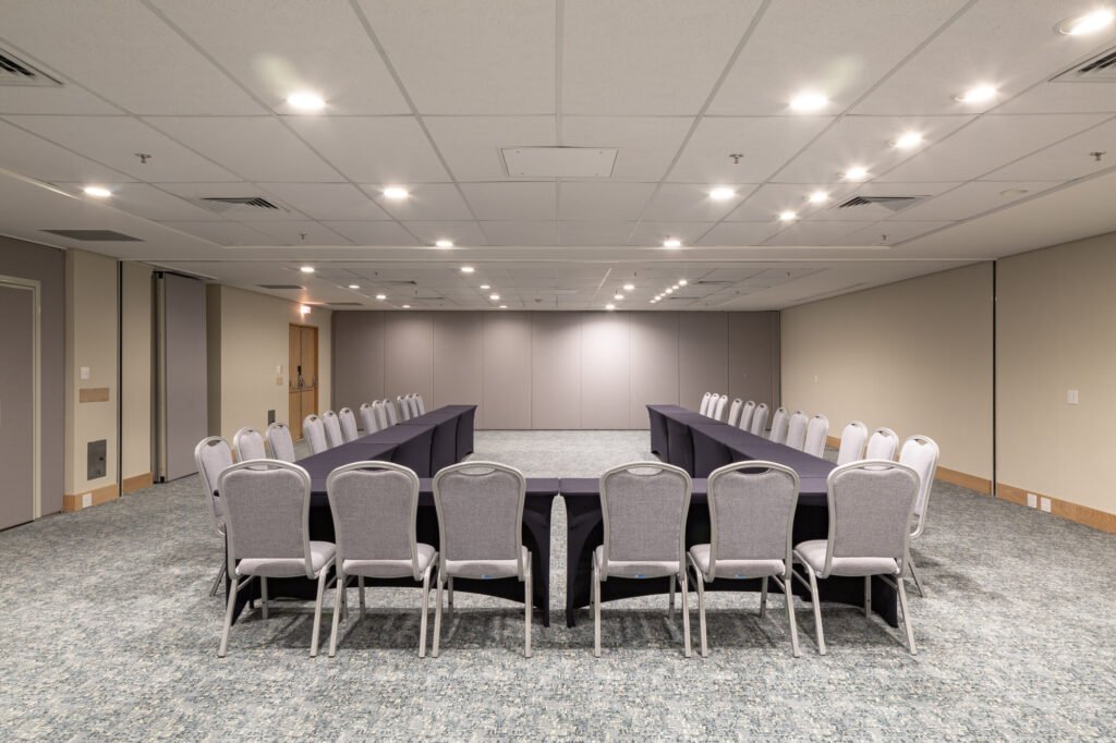 Adequado para grupos com menos de 40 pessoas. Eles são melhores para interação com um líder sentado à frente da configuração. O audiovisual geralmente é melhor instalado na extremidade aberta dos assentos. |